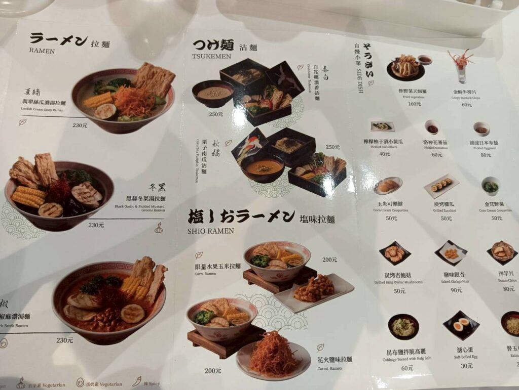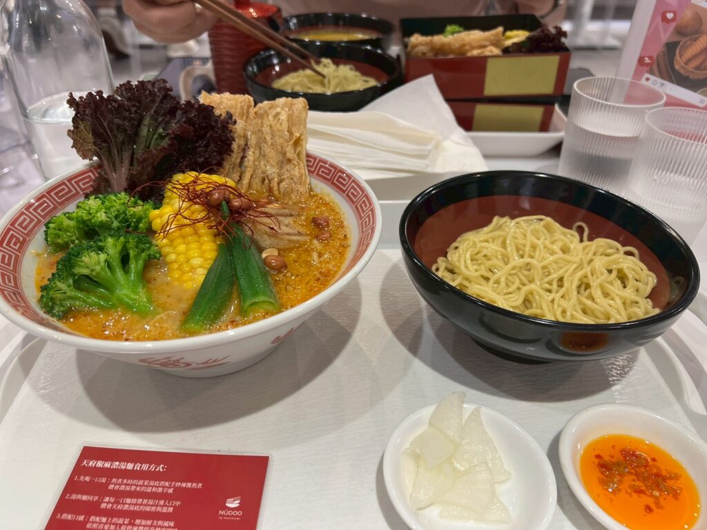 ★4.5。店内は白基調で清潔。全品ベジタリアン(純素/蛋奶/五辛の選択あり)で、「体にやさしいのに満足できる」タイプ。今回は栗かぼちゃつけ麺を注文。食べたことのない濃厚さで、でもちゃんとラーメン。野菜もたっぷり。替え玉と野菜は“お重箱”みたいな豪華セットで出てきて、ちょっとおせち感。楽しい。