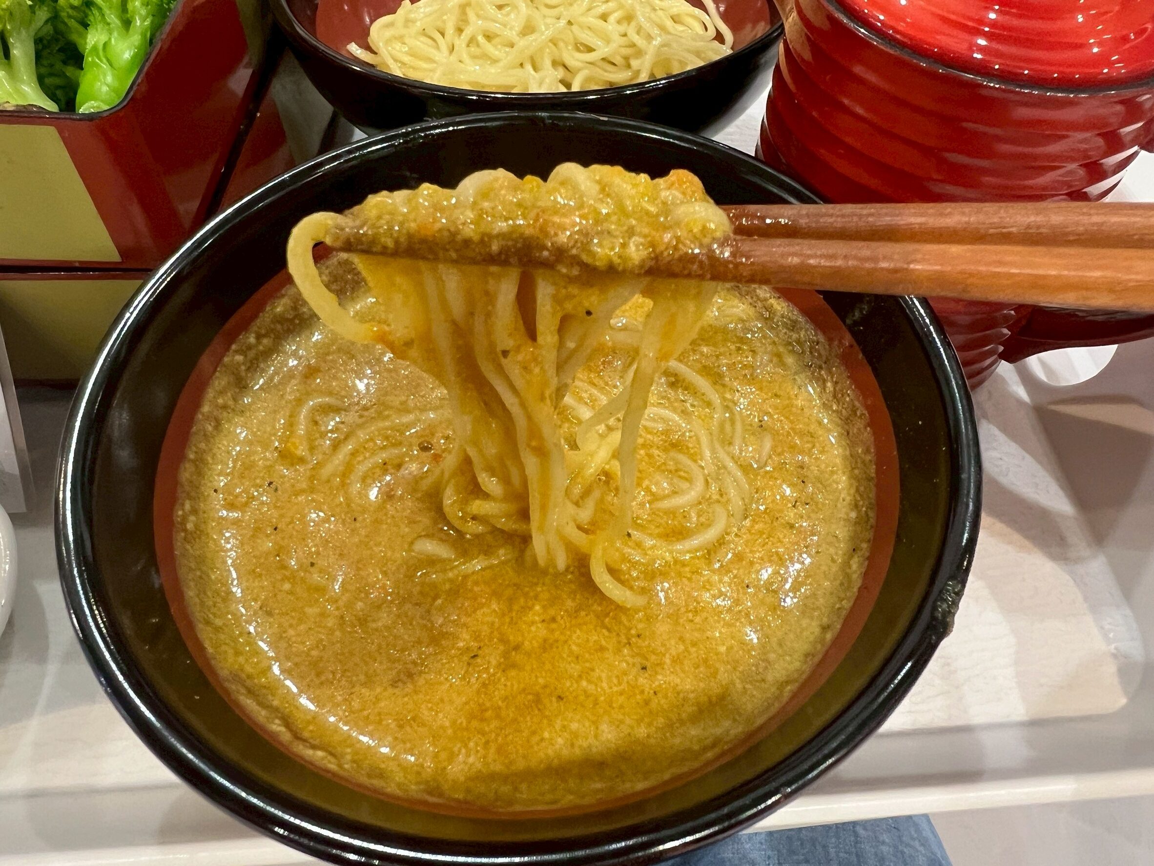 - 栗かぼちゃの個性が立ったつけダレ。新鮮だけどちゃんとラーメン。