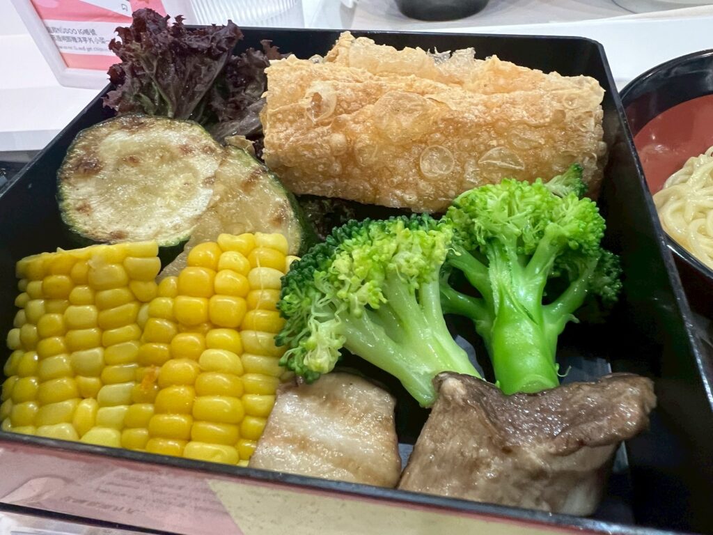 嬉しかったのが替え玉+野菜の“お重箱”。仕切りのある箱に色々盛られてきて、ちょっとおせち。テーブルに運ばれた瞬間にテンションが上がる。
