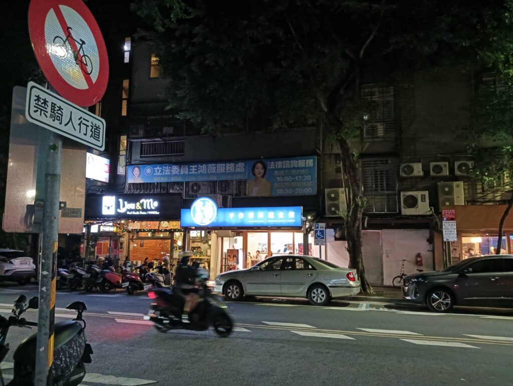 台北・松山の住宅エリア。延壽街沿いの小さな店。赤い看板と湯気、近所使いの空気感。