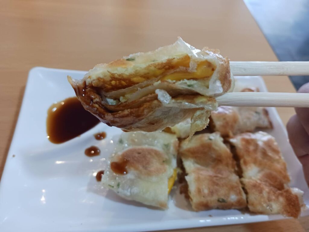 台湾の蛋餅は甘めソースや五香粉が強い店もありますが、ここはクセが出過ぎない。“日本の口”でもするする進むタイプ。朝の一皿にちょうどいい。