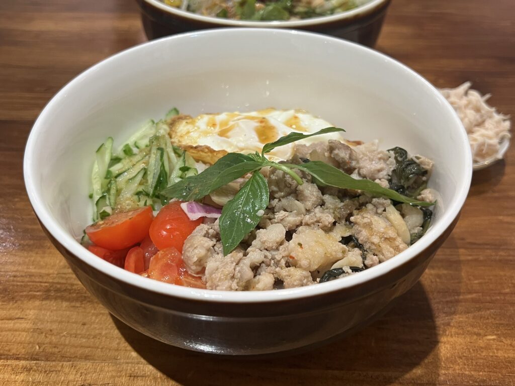 まず香りが良い。バジルの爽やかさと肉の旨みがまっすぐ来て、嫌な匂いはゼロ。味付けはキレがあって、白ごはんがどんどん進むタイプ。辛さは“おいしい刺激”の範囲で、日常的に食べたくなるバランスでした。