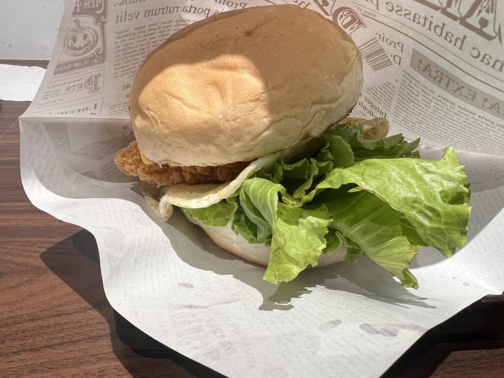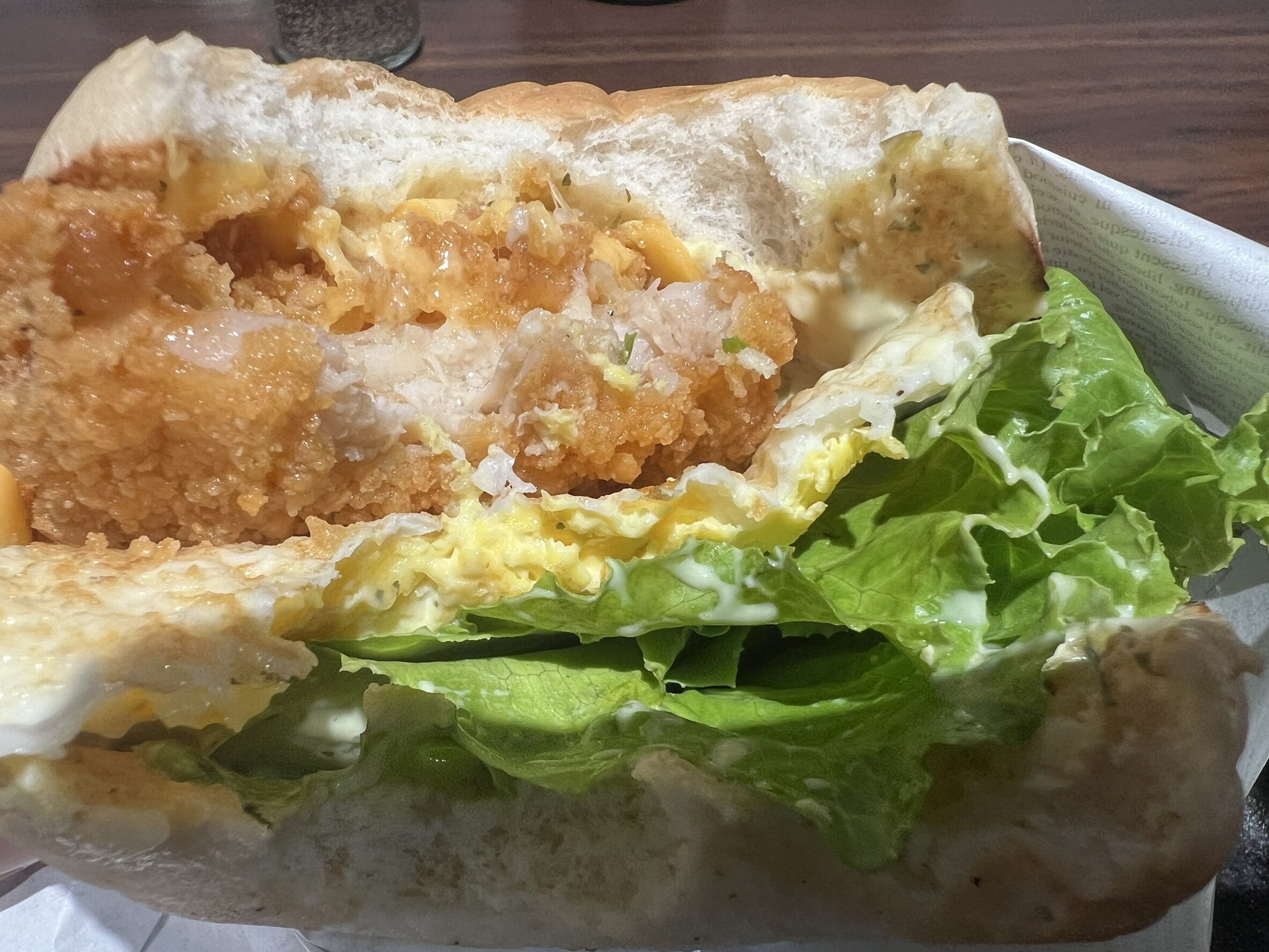 衣はザクッ、中は肉汁。カイワレやレタスのフレッシュ感が油を軽くしてくれる。辛さは“ピリ辛”で、日本人でも食べやすいレベル。バンズがふかっと甘く、ソースも重くない。朝からガッツリ派に刺さるやつ。
